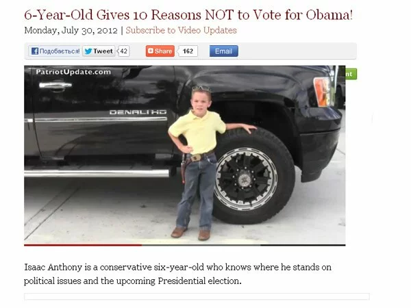 В предвыборной гонке не остается ничего святого. Вот, скажем, в эти нечистые процессы часто привлекают детей. Мы сейчас не будем говорить о антиморальности таких поступков, а лишь приведем факты. Недавно The Patriot Update опубликовал ролик, в котором маленький мальчик просит всех потенциальных избирателей не голосовать за Обаму.